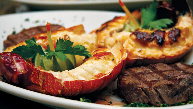 | Pratos preparado pelo próprio dono do restaurante, Luís Carreira: filé mignon com cauda de lagosta |