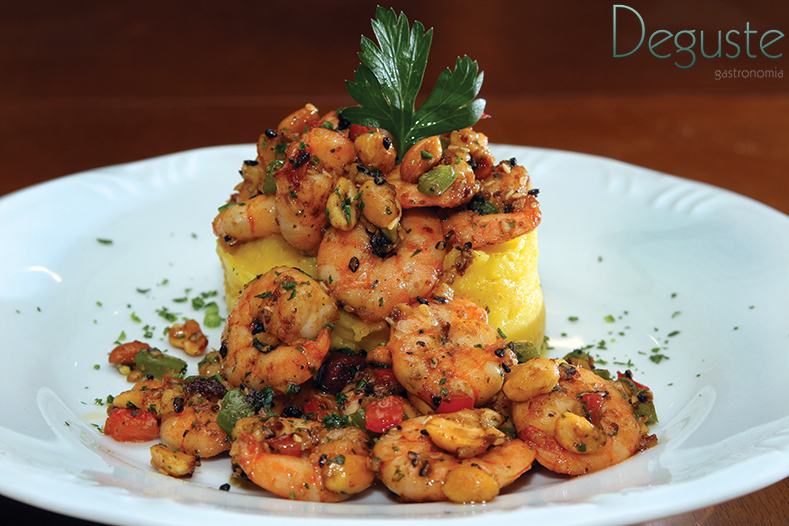 Camarão tailandês – salteados com azeite, gengibre, pimentões, gergelim, molho de ostras e amendoins torrados