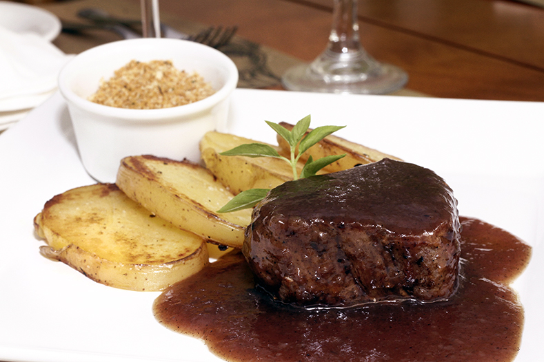 | Filé ao Cabernet (filé grelhado acompanhado de batatas douradas, redução de cabernet e farofa de ervas) |