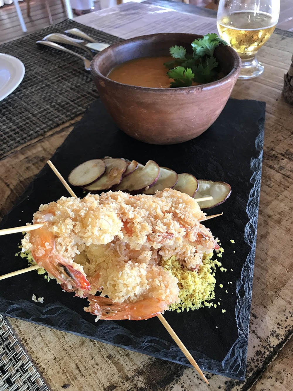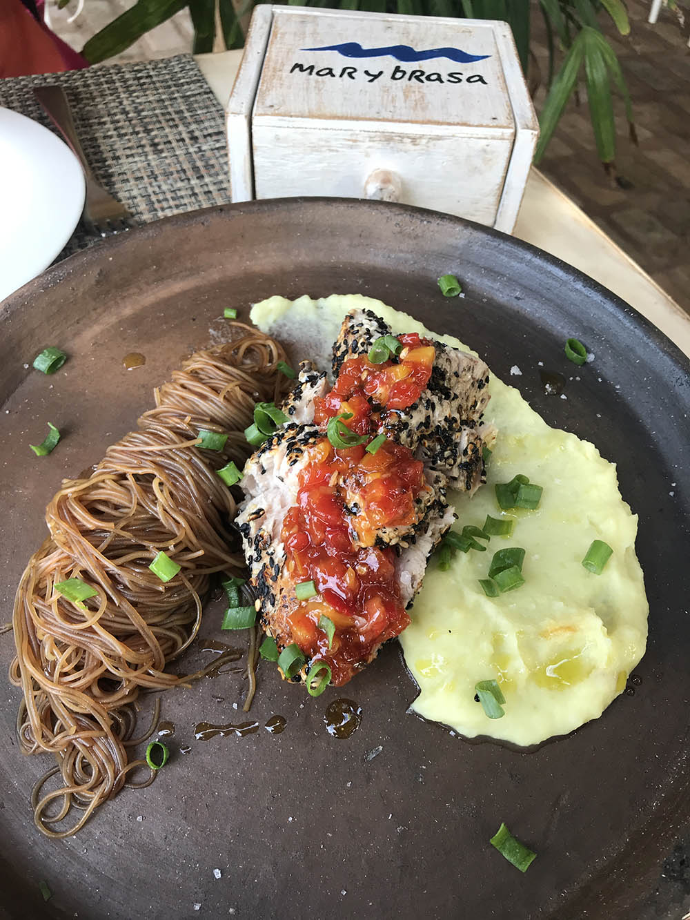 Restaurante de praia também aberto para não hóspedes, o cardápio do Mar y Brasa tem a assinatura do chef italiano Lorenzo Mancini, que faz um passeio pela cozinha mediterrânea, valorizando o frescor dos peixes e dos frutos do mar. Mas produtos da gastronomia regional também estão presentes em alguns pratos, bem como a nacionalidade do chef, que se revela nas massas frescas e artesanais, muito pedidas pelos clientes e hóspedes, como o famoso Agnolotti de jerimum. Outra boa massa é o Ravioli verde recheado com ricota, tomates secos e nozes, servido com tomates frescos e parmesão.
