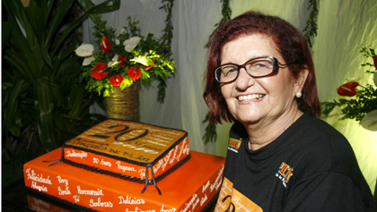 | Dona Adalva Rodrigues posa orgulhosa ao lado do bolo
