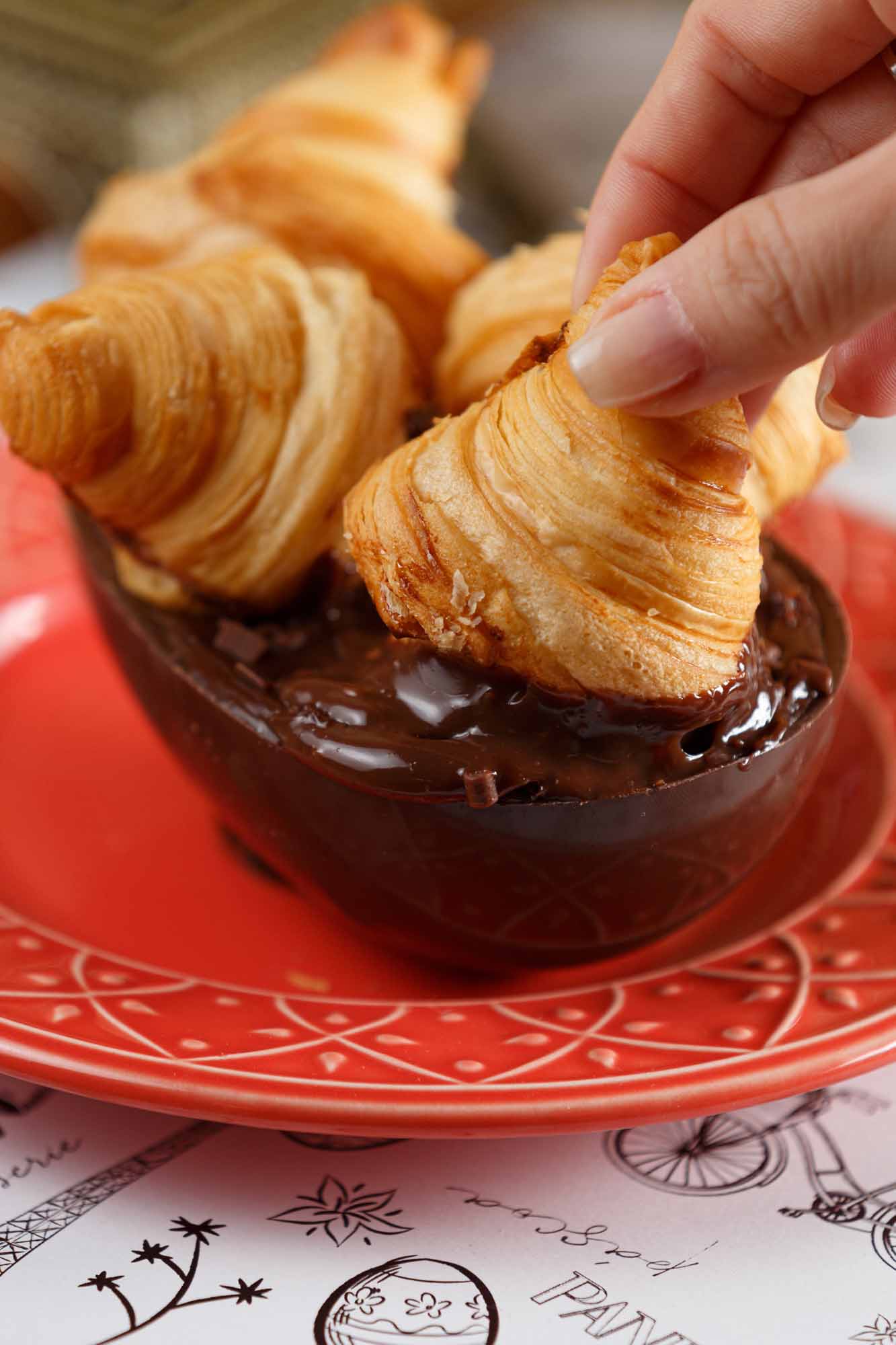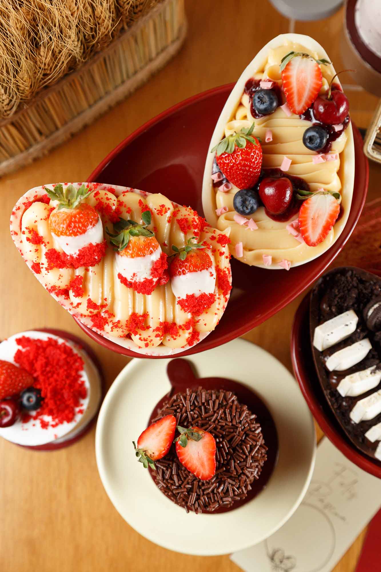 E ainda foi desenvolvido um ovo surpresa, a grande aposta para essa Páscoa. “É um ovo fondue, que acompanha oito mini croissants para serem mergulhados no chocolate cremoso”, explica o chef pâtissier Fernando Targino, proprietário da Paneer ao lado da esposa Samara Gurgel. “É algo diferente do que, geralmente, se encontra na cidade. Na verdade, foi pensado para ser consumido na loja, mas conseguimos também disponibilizar para viagem”.