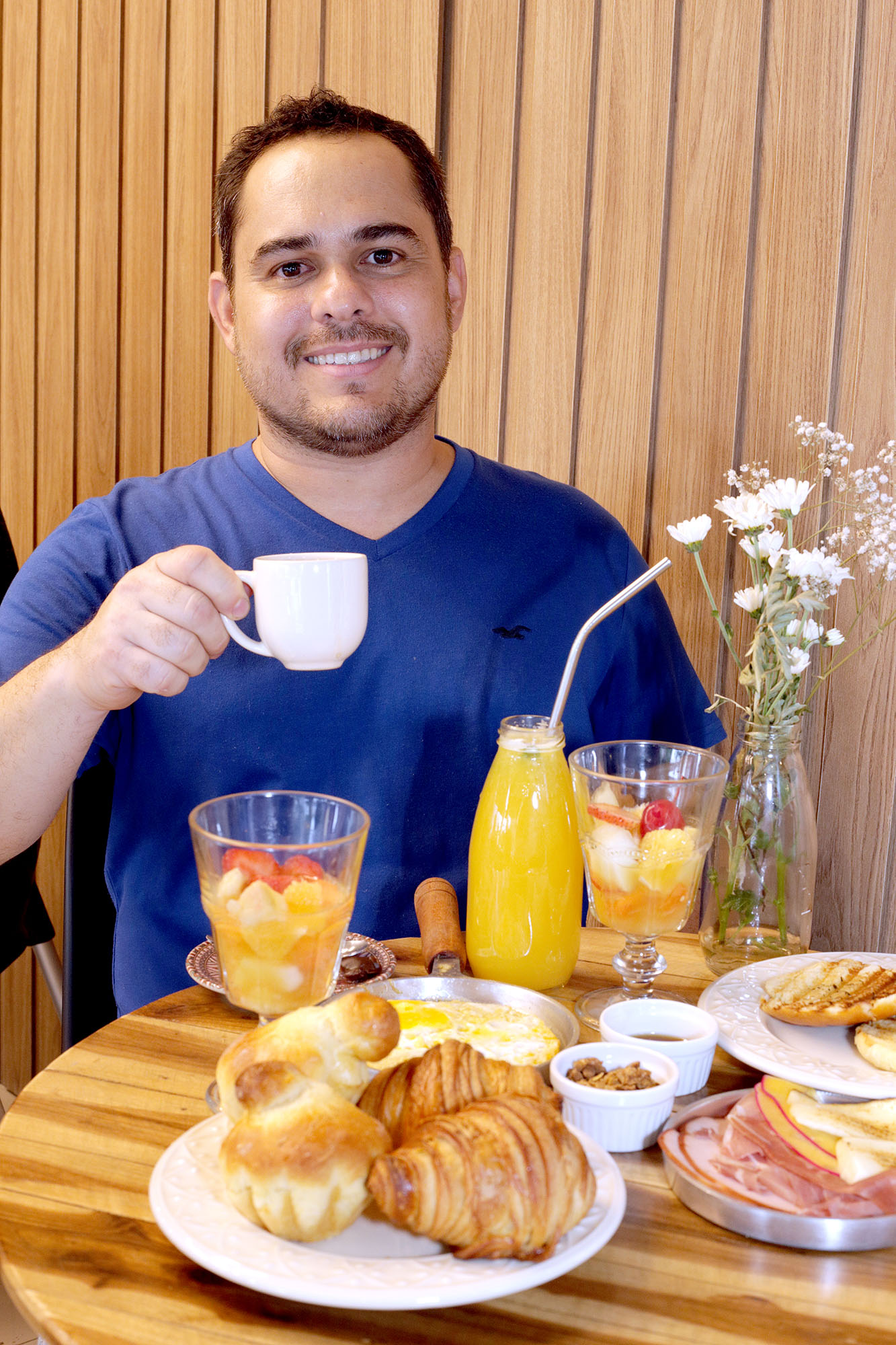 O café é servido em formato de combo para duas pessoas, com 2 mini brioches, 2 mini croissants, 1 pão panner na chapa, 1 panelinha de frios (peito de peru defumado, queijo do reino, queijo coalho e presunto parma), 2 ovos mexidos, 2 taças com salada de frutas, 2 xícaras de café ou 2 sucos de laranja ou 1 de cada, 1 ramequim de queijo panner, 1 ramequim de geleia, 1 ramequim de mel e 1 ramequim de granola. Tudo isso por apenas R$ 55.