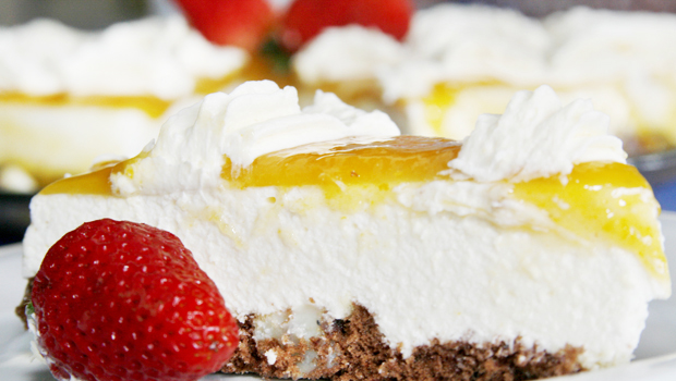 Torta de graviola com cobertura de cajá, uma deliciosa mistura servida como sobremesa no menu da  Noite Nordestina