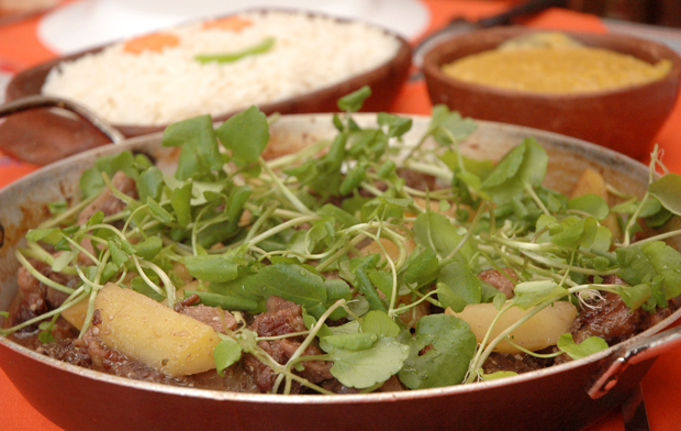Por último, a rabada volta ao fogo com o restante do caldo e o tempero que estava reservado. Está pronta a rabada light, que é servida com agrião, arroz e polenta. Para essa receita, Lourimar Neto usou um quilo de rabo bovino. No Costela no Bafo, ele também dispõe da feijoada light.