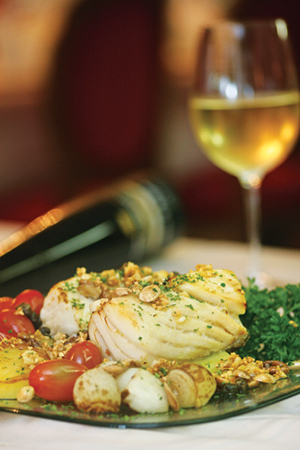Dessalgue o bacalhau por 7 dias. Cozinhe levemente no leite por 15 minutos. Depois leve ao forno com bastante azeite, batatas e ceboletes. Quando dourar, retire do forno. Refogue as amêndoas, nozes e alcaparras, no azeite, em seguida colocando os ovos de codorna cozidos e, no final, coloque o tomate cereja. Jogue o refogado sobre o bacalhau. À parte, faça um refogado de alho com azeite picadinho e jogue por cima de tudo. Salpique com salsinha, sirva com arroz de brócolis ou arroz de alho.