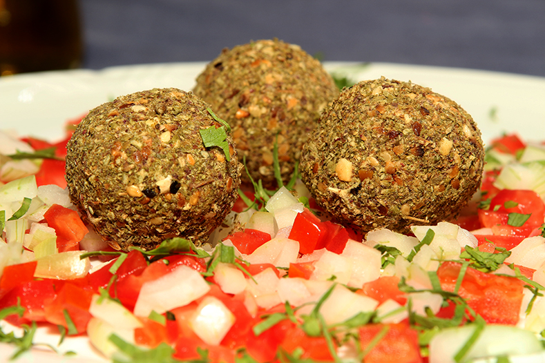 | Mix de pastas (grão de bico, coalhada seca e berinjela), que é servido com pães árabes |