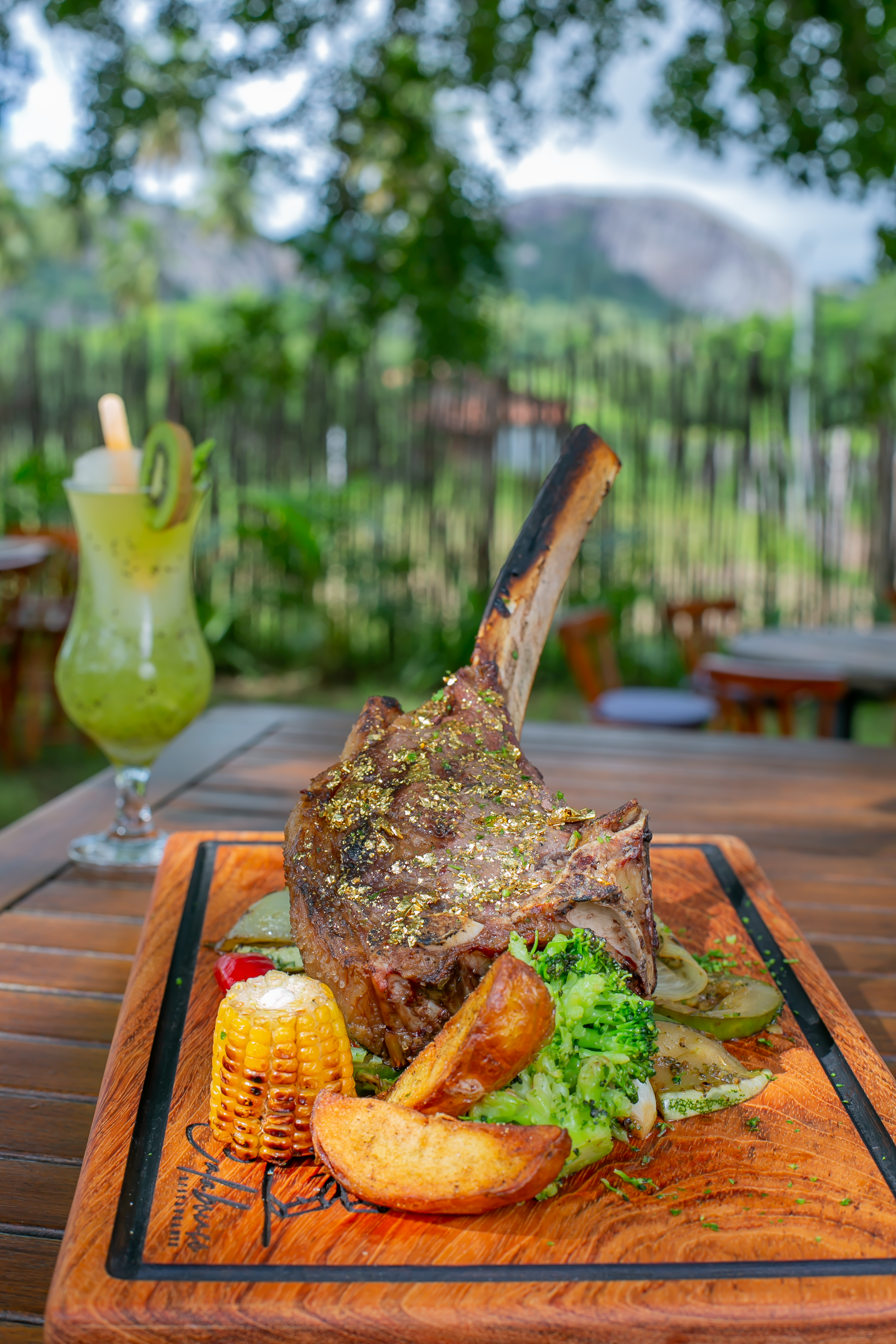 No cardápio, há boas opções de entradas, como um Mix de pastéis, Carpaccio, Filé com fritas, Tulipa de frango e Costelinha de porco. De pratos principais, destacam-se o caprichado Bife de chorizo com crosta de parmesão, a Picanha assada na pedra de sal, o Carré de carneiro ao molho de hortelã, o suntuoso Tomahawk (steak de tomahawk selado envolto em folha de ouro e molho picante, acompanhado de arroz cremoso e legumes grelhados) e a Carne de sol na brasa com queijo coalho.