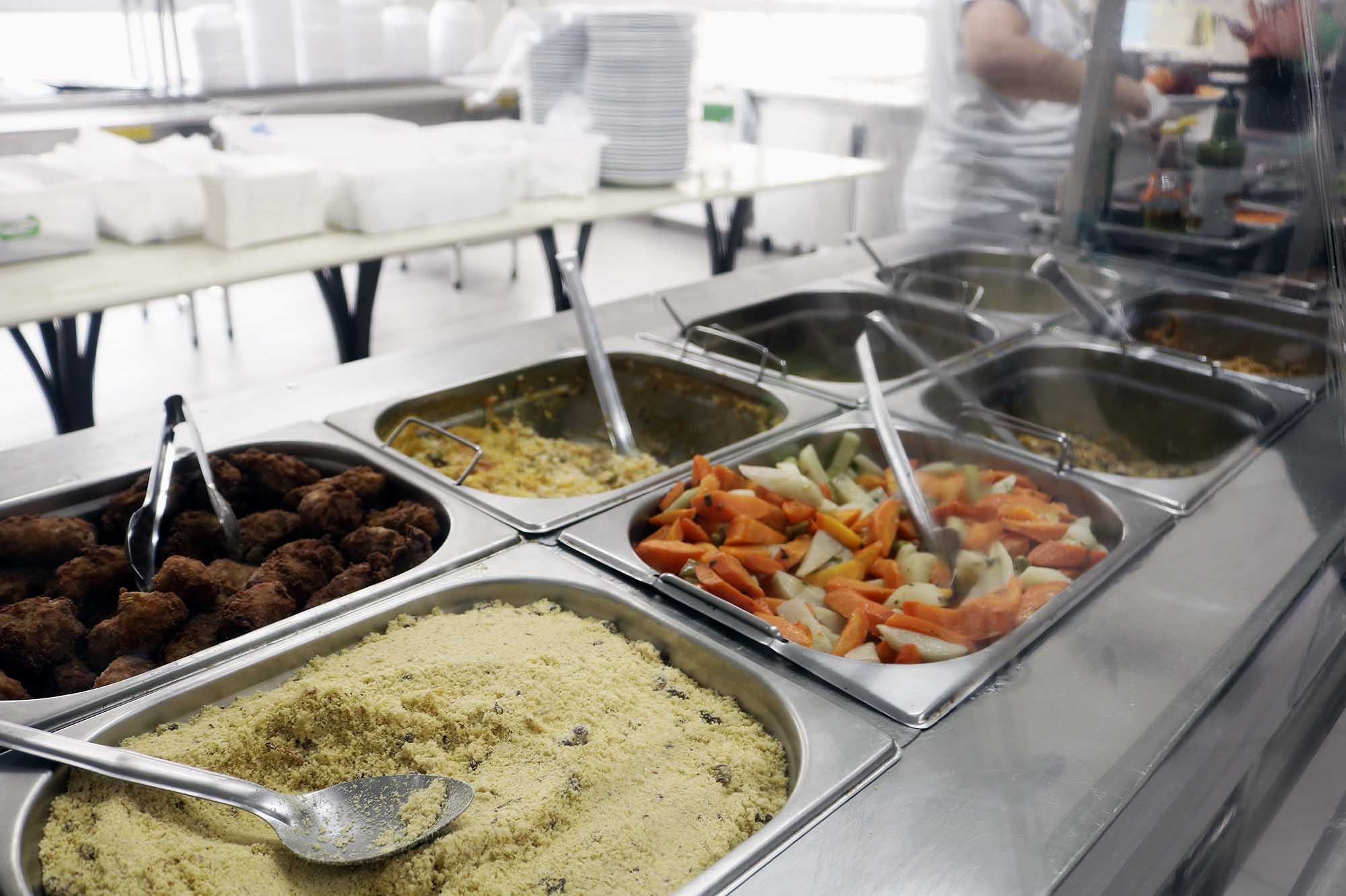 Nas ilhas onde fica o bufê, o pessoal treinado pelo SESC é quem monta os pratos a partir do pedido do cliente, para evitar contato das pessoas com os objetos de entrega da comida e nas cubas.