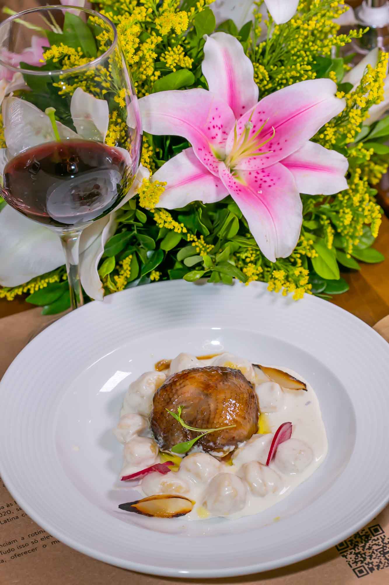 Os dois pratos principais foram: Codorna desossada e recheada com ela mesma, acompanhada de gnocchi de mandioquinha e cogumelos franceses; e Bacalhau confitado com mousseline de alho, terrine de berinjela, cenoura orgânica e couve-flor crocante.