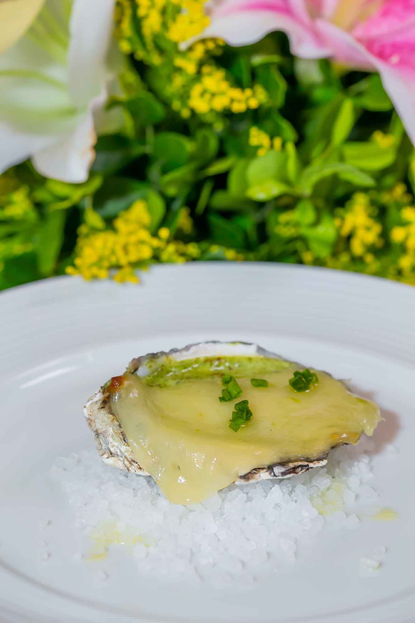 De entrada, foram servidos dois pratos: Ostra gratinada e recheada com espinafre, bacon e queijo manteiga, e Carré de cordeiro servido com salsa verde, cenoura orgânica glaceada, kefir e hortelã.