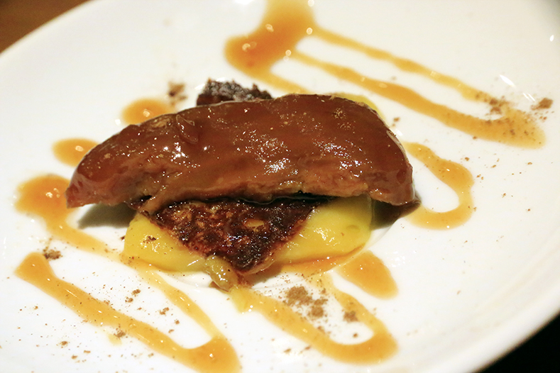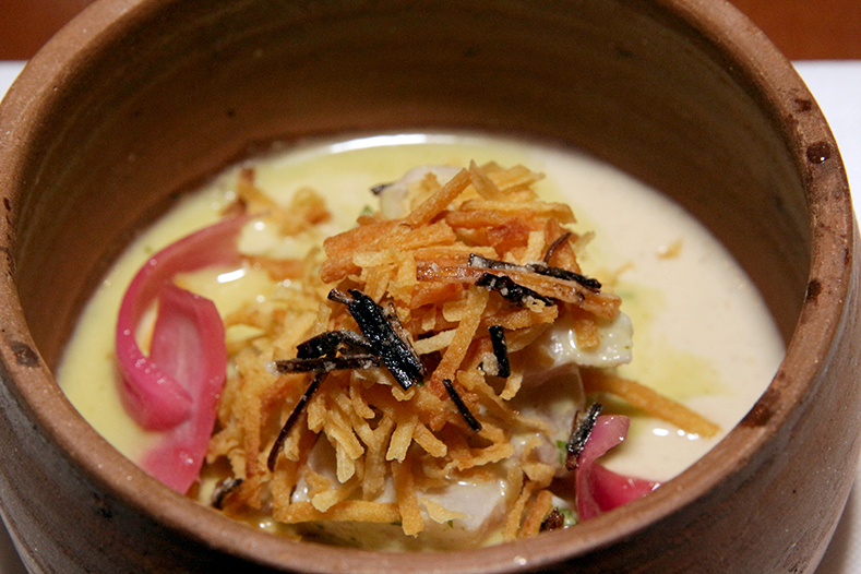 Harmonizado com uma flut do espumante francês Henri Leblanc brut, a primeira entrada servida foi o Ceviche Mahi Mahi, feito com lâminas de dourado marinadas no limão com cubinhos de tomate, uvas, pétalas de cebola roxa agridoce e ervas frescas, sobre “ajo blanco” de castanha de caju, palha de batata doce e alho-poró. O sabor levemente cítrico desse prato casou perfeitamente com o frescor do espumante.