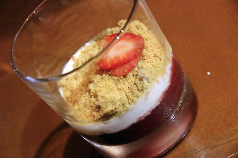| Coulis de frutas vermelhas, sorvete de creme, chantilly de cupuaçu e crumble de castanha de caju |