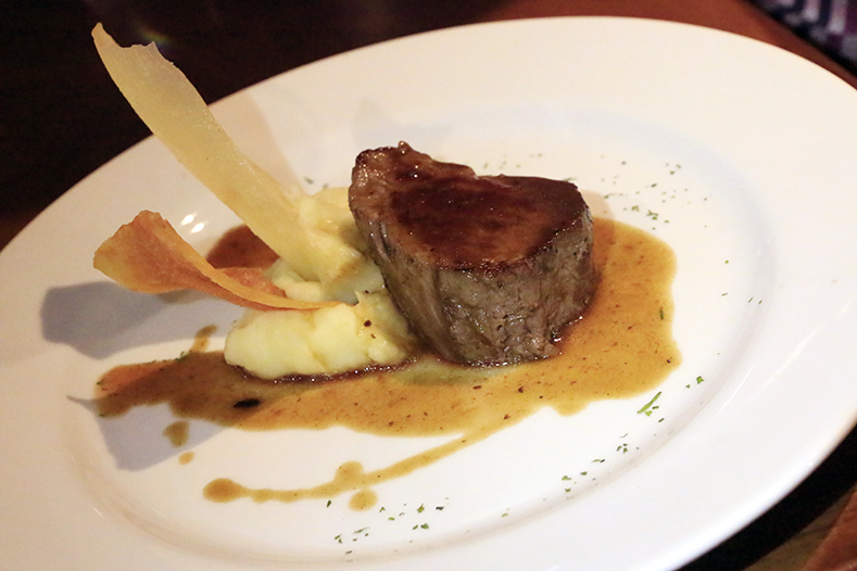 A pegada mais regional da noite ficou por conta do último prato, o Filé Tradicão, um filé mignon servido grelhado ao molho do assado, purê de batatas ligado ao mix de queijos de coalho, manteiga e minas, com macaxeira chips. Para ‘encarar’ a força da carne, o vinho escolhido foi o Pumo Primitivo Salento, do sul da Itália. Missão cumprida!