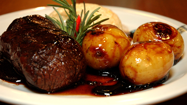 | Tournedo ao Porto – filé grelhado com redução de vinho do porto, servido com arroz cremoso e batata caramelizada |
