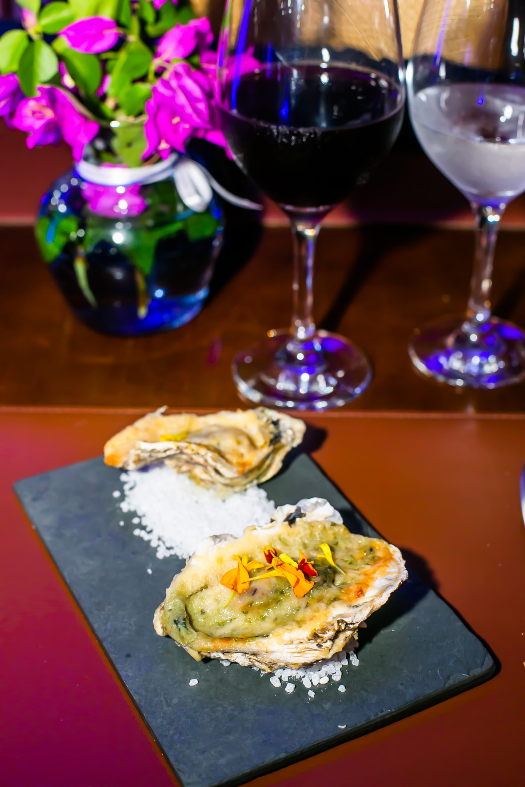 No jantar dessa quarta-feira, com o tema “Sabores do Mediterrâneo”, foi servido de entrada o Petit tour Tadeu Lubambo, feito em homenagem ao chef expoente da gastronomia potiguar. Já o primeiro prato foi o Camarão grelhado no fogo, ravioli de gema curada e pangrattato.