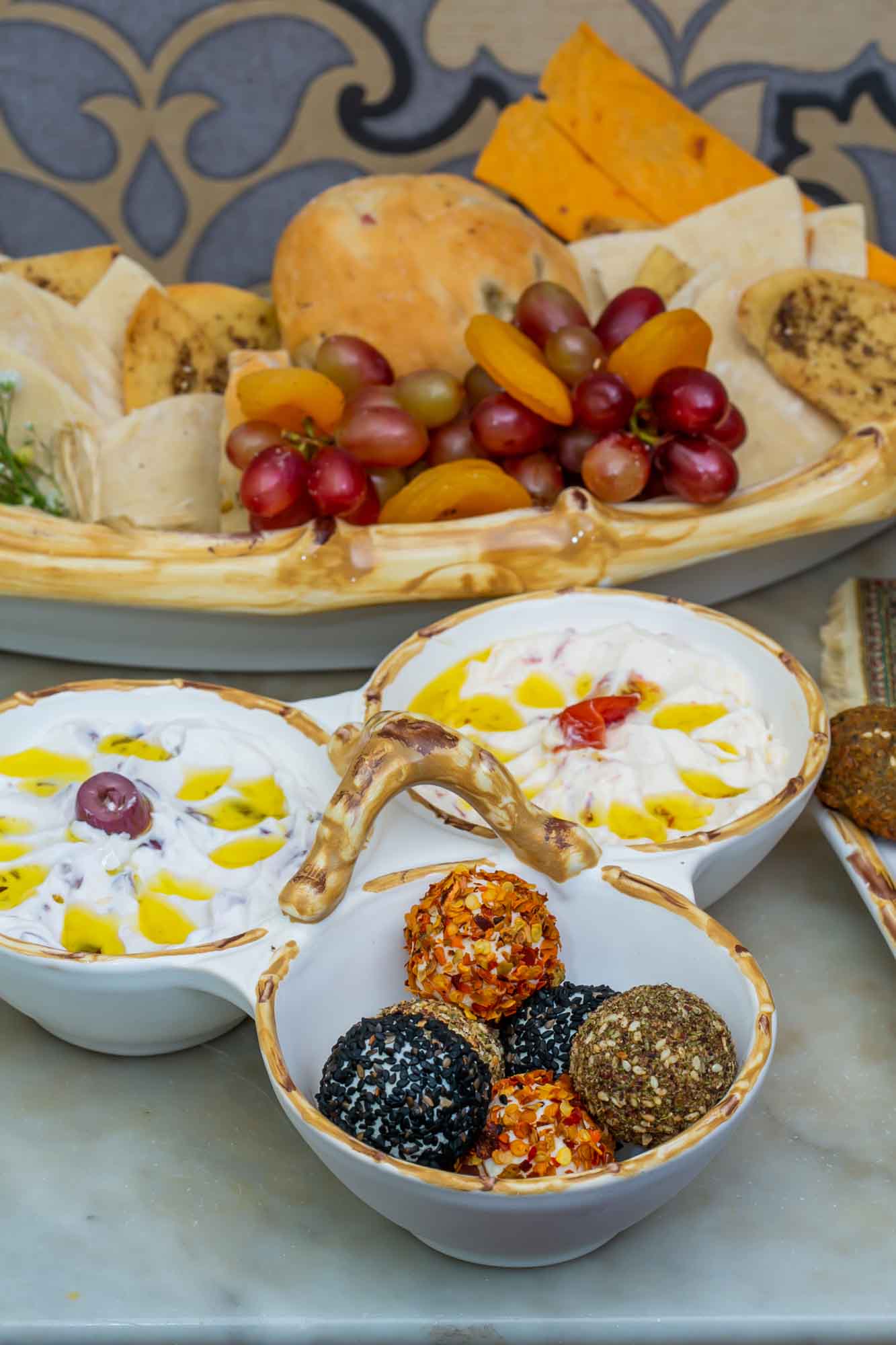 Há dois formatos para duas ou quatro pessoas, contendo quibe frito, Falafel, coalhada com tomate seco, coalhada com azeitona (lançamento), uma porção de homus, outra porção de caponata árabe, frutas, pães e um pão com azeitonas ou zatar, esta é uma erva árabe.