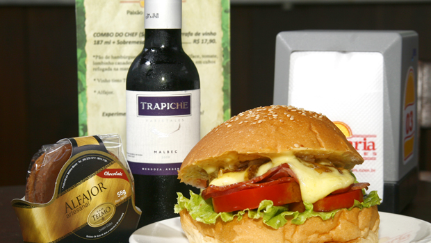 | Combo do Chef, uma combinação surpreendente de sanduiche, vinho e alfajor |
