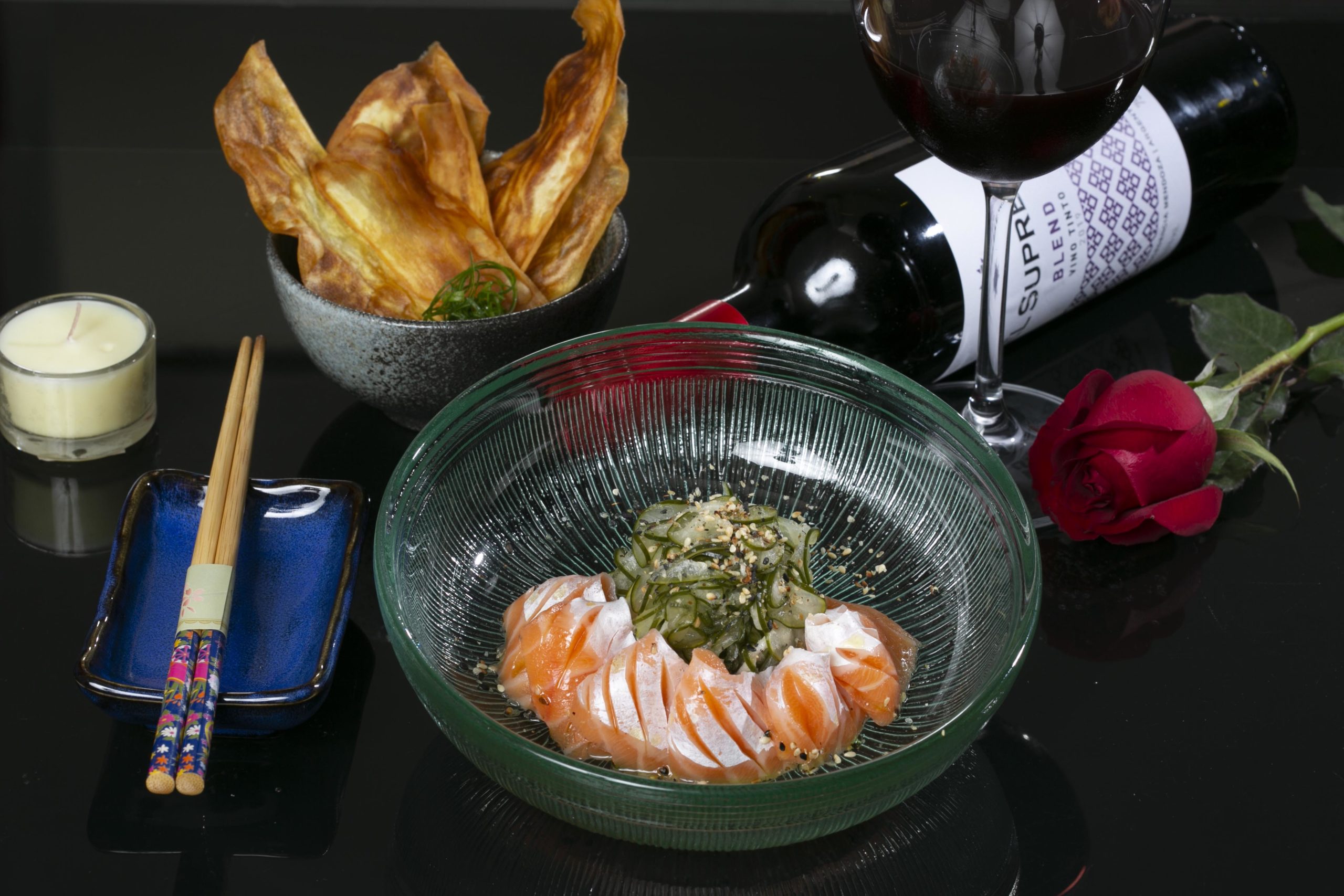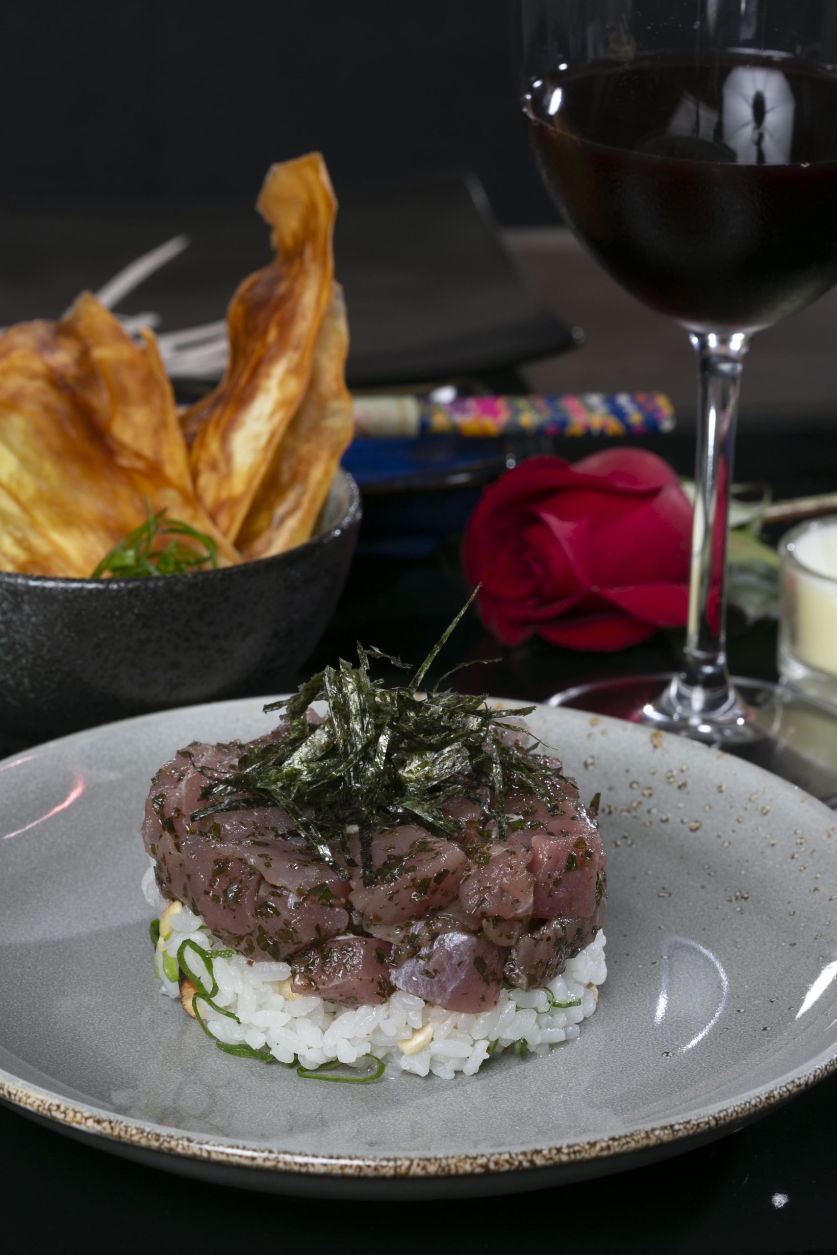 Para a entrada do jantar, o cliente pode escolher entre as opções Tartar de atum trufado, Ceviche Aji, Sunomono de salmão trufado ou Anel de lula com camarão em seis unidades.
