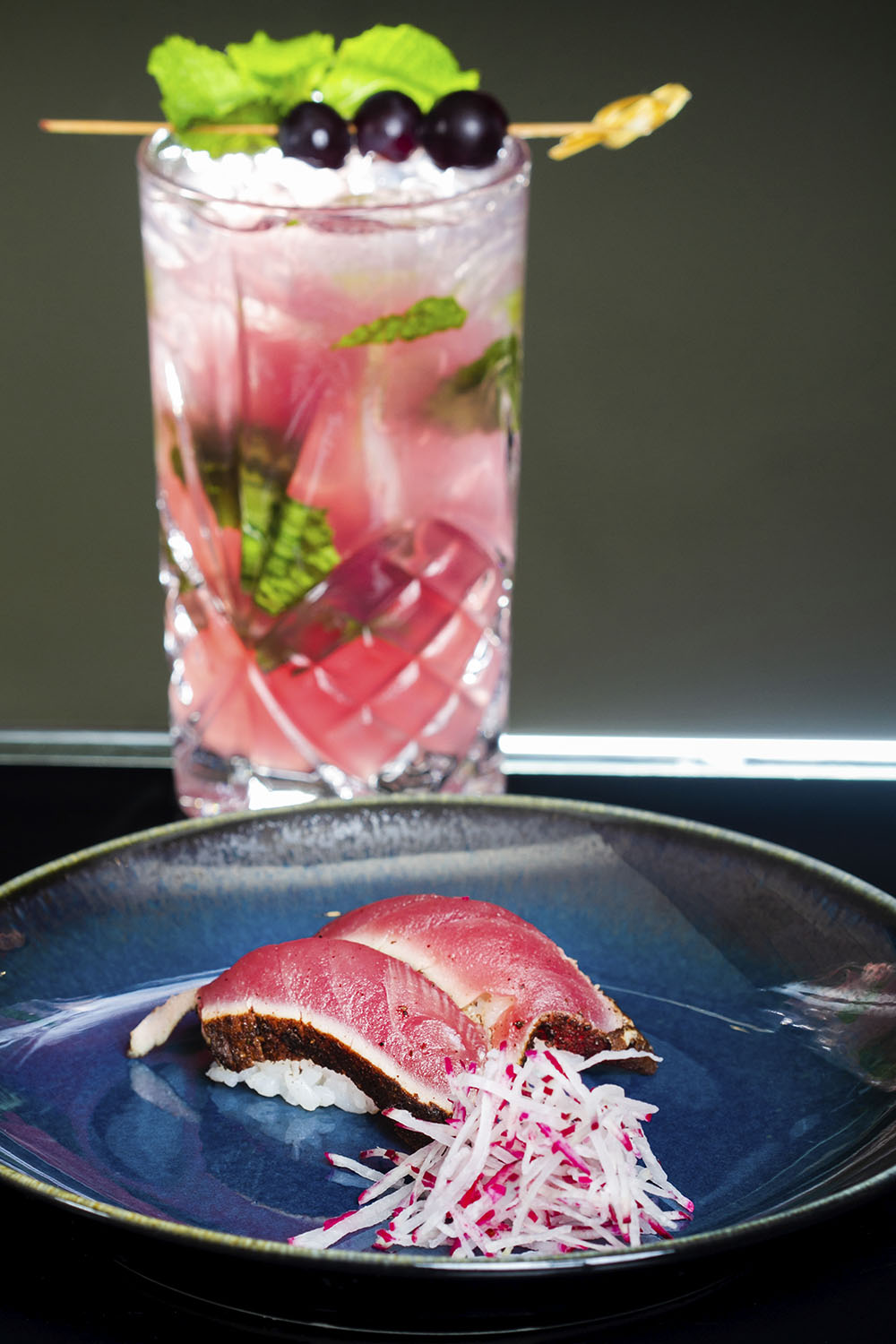 Em primeiro plano, sushis da casa; ao fundo o drink Aichi (Vodka, lillet, pure de pitaya com violeta, pepino, hortelã e sumo de cítricos)