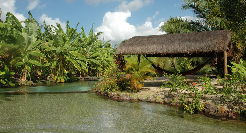 O rio Catolé margeia a estrutura construída para dar sombra às 12 redes espalhadas pelo paraíso
