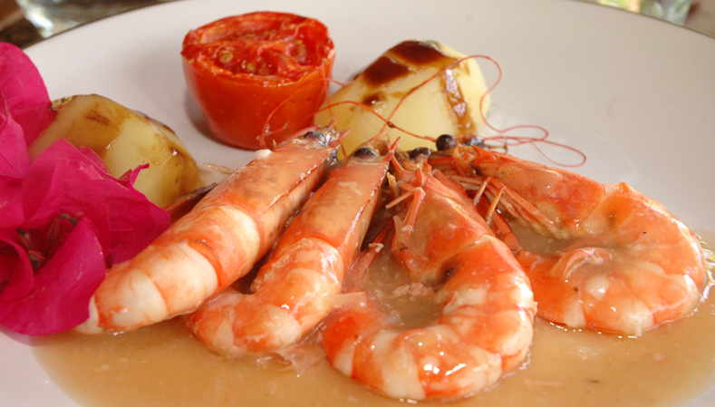 Camarão Bunvile, feito na manteiga com brandy, maizena e ervas, acompanhado de batata cozida e tomate grelhado