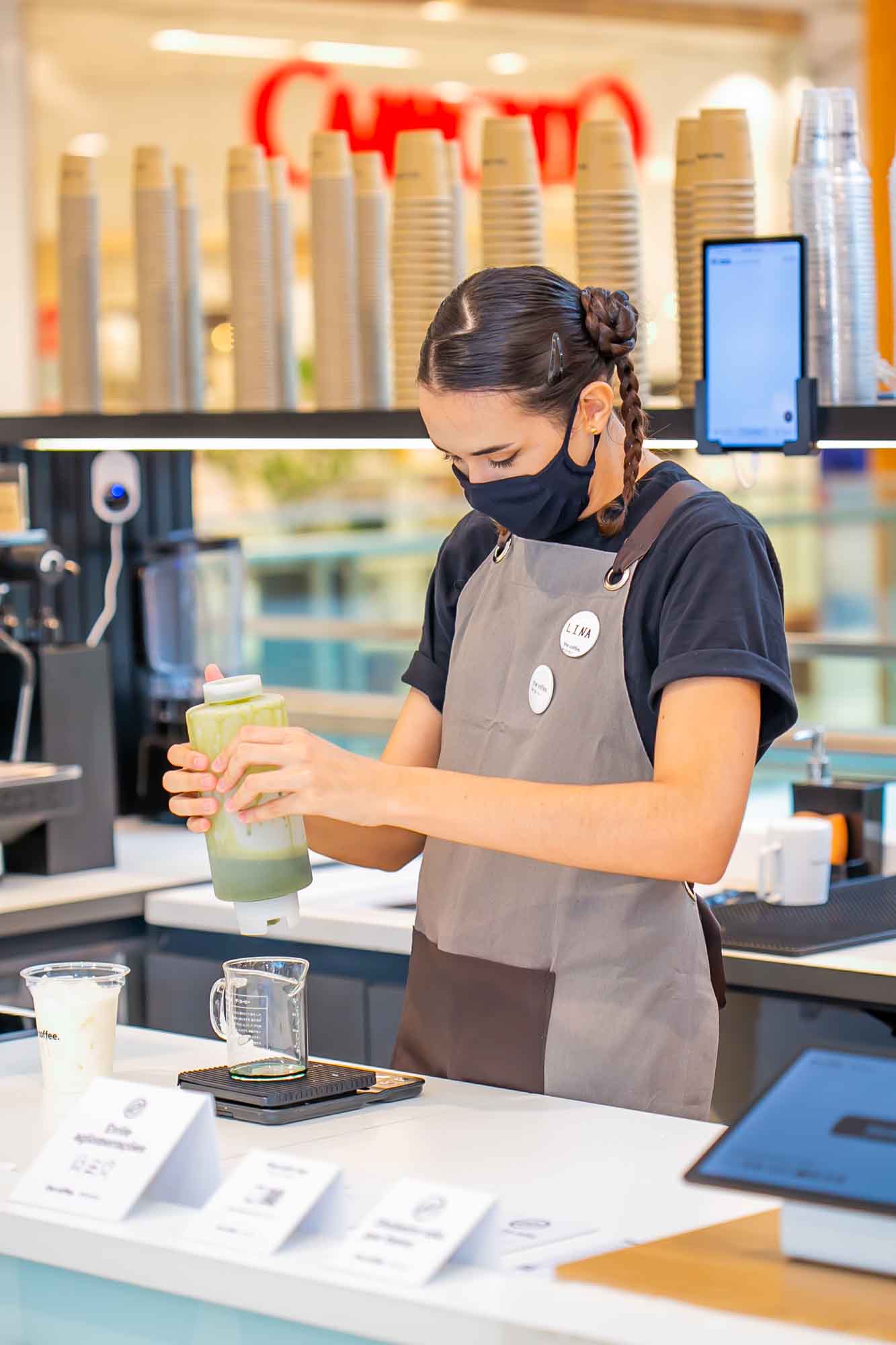 O funcionamento da cafeteria é no modelo “to go”, ou seja, pegar o café e sair tomando. Para a The Coffee, a inspiração veio de Tóquio, cidade com mais cafeterias desse estilo no mundo. A experiência de compra é prática e rápida, com o próprio consumidor realizando o seu pedido por meio do tablet no balcão ou através do aplicativo da marca. Tudo de forma bem intuitiva e dinâmica.