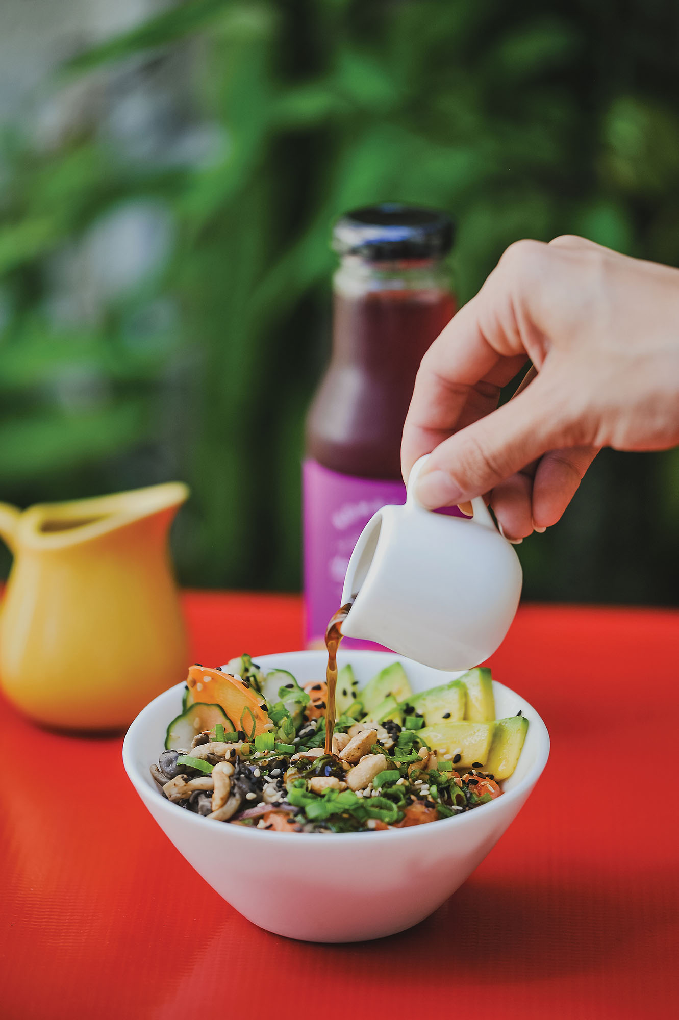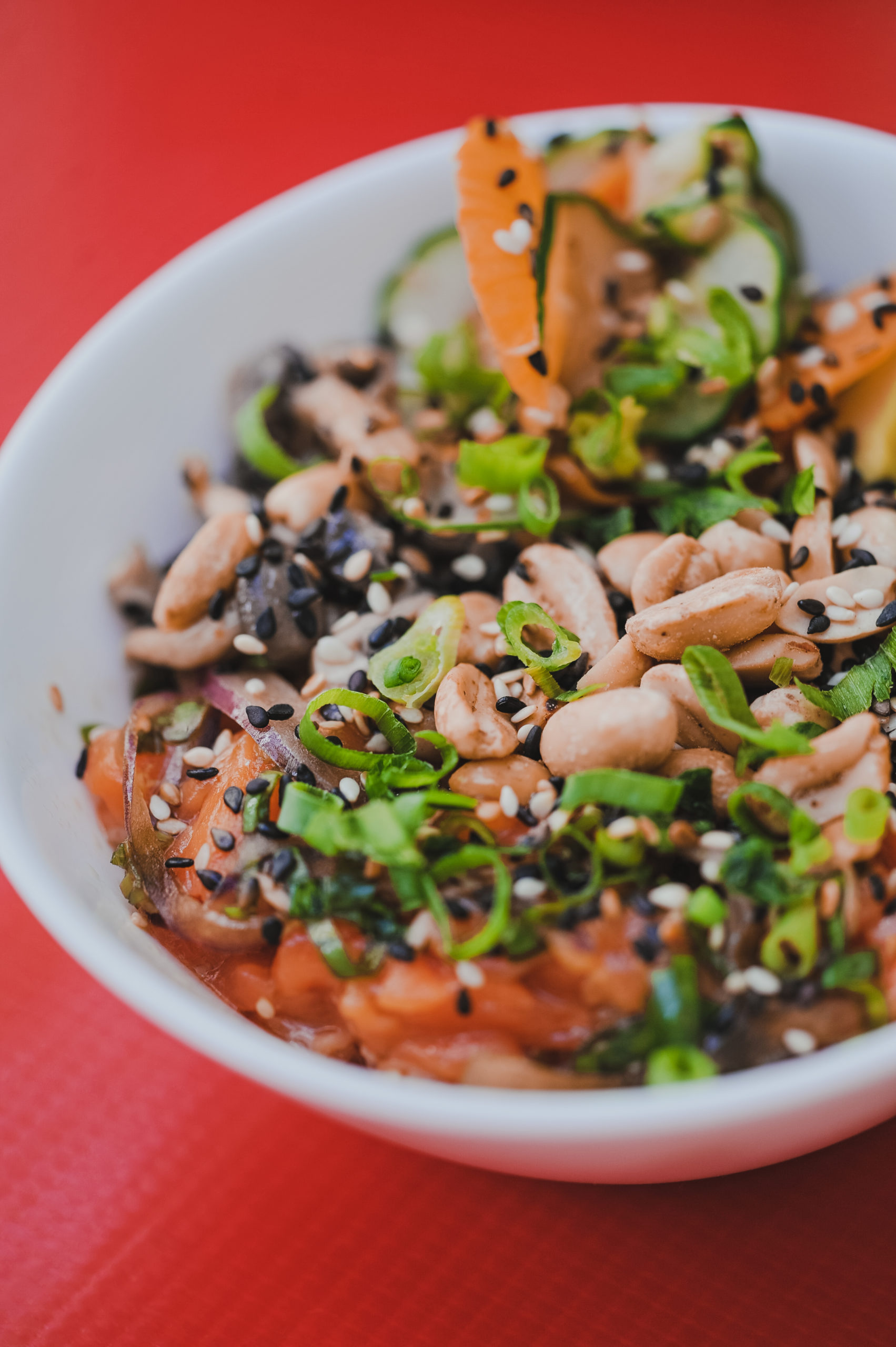 A salada thay de camarão tem mamão no preparo e a salada quente oriental de frango, espaguete de cenoura e óleo de gergelim, tudo com teor reduzido de sódio, sem glúten e sem lácteos. A lista apresenta ainda poke de salmão ou cogumelos, servido com arroz de couve flor, sunomono funcional, sem açúcar, abacate, amendoim e gergelim.