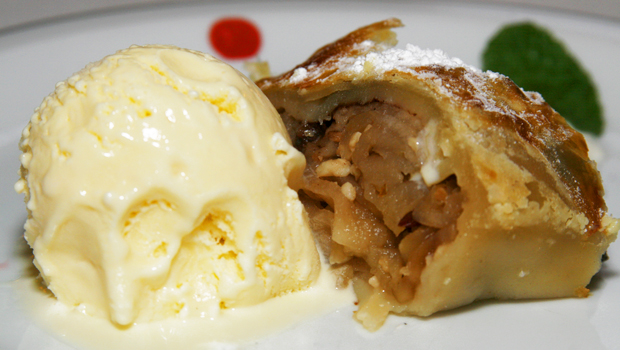 | Sobremesa de Apfeistrudel com sorvete de creme |