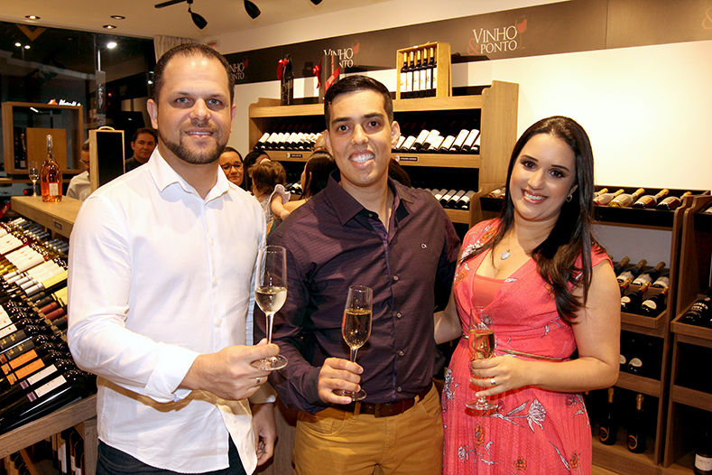 | O casal Eider Cortez e Jôsi Gomes, dono da Vinho & Ponto Natal, ao lado do sommelier da rede, Eliton Bertoli |