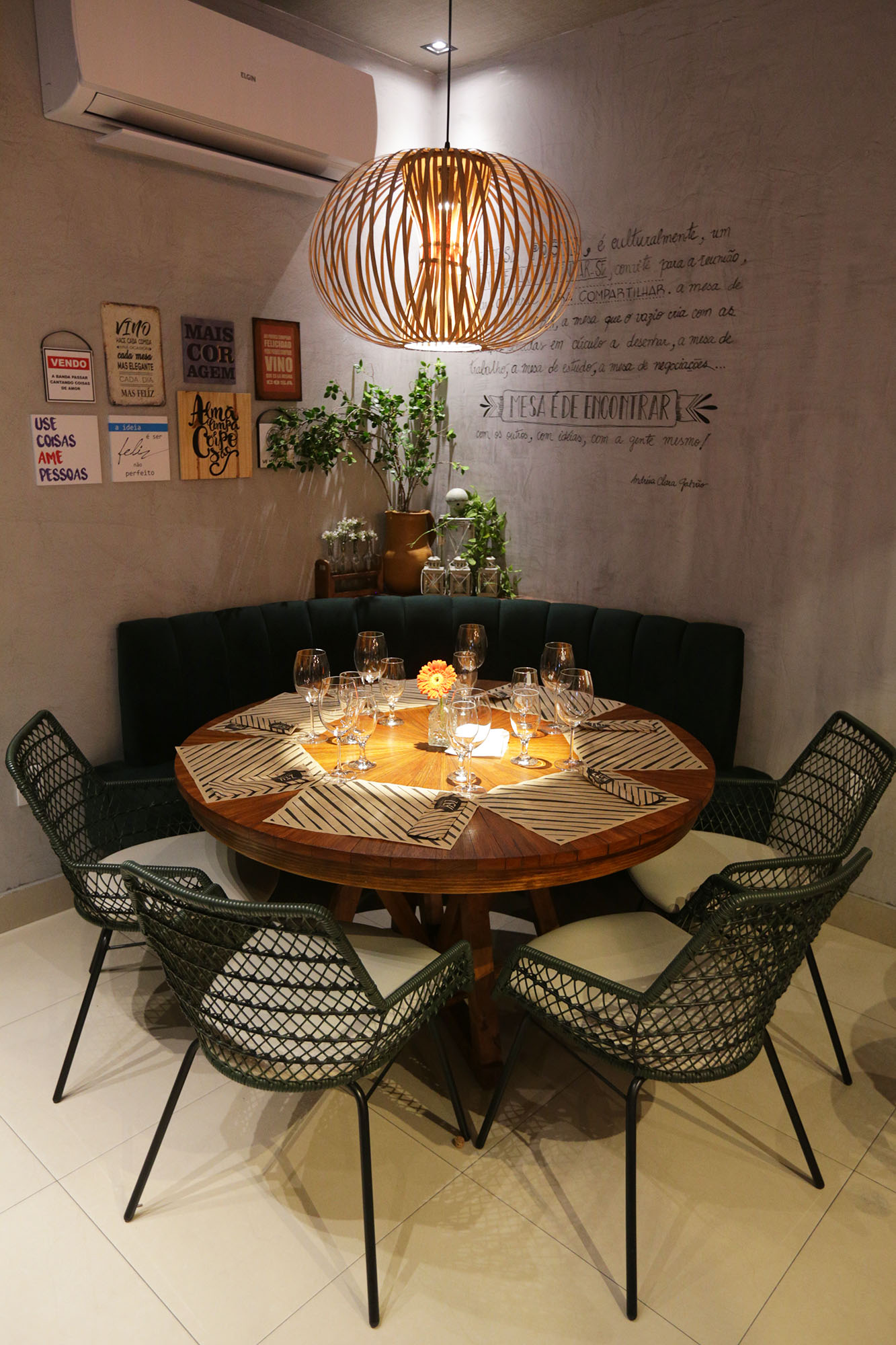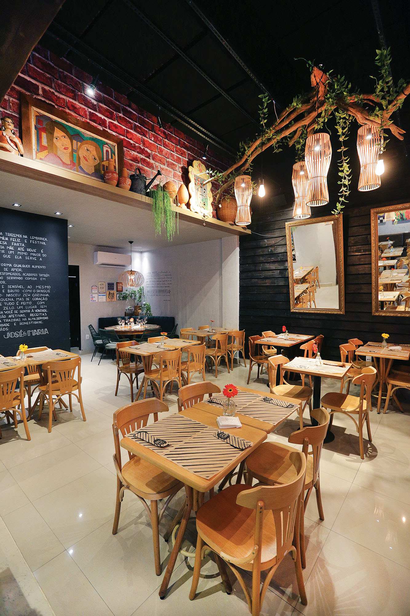 O ambiente, que comporta até 110 pessoas com mesas no deck, é cheio de peças também de herança e garimpo. Uma máquina de costura foi da tia; objetos de decoração, da casa do pai; o moinho de milho e a máquina de escrever foram doações de clientes. “Tudo tem uma historinha. É um restaurante com alma”, conta Maria Cláudia. Na parede, quadros do artista plástico Flávio Freitas sinalizam a história dos irmãos José e Maria.