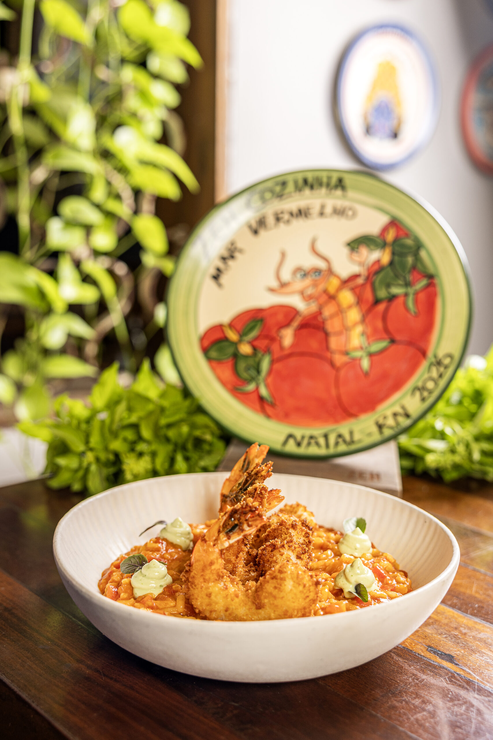 “Na cerâmica criada para acompanhar o prato, há o vermelho intenso no centro da composição, o que remete aos tomates maduros do arroz e criando um cenário vibrante. Já os camarões aparecem em destaque, cercados por formas orgânicas e cores que celebram a alegria. Trata-se, portanto, de uma mistura de culturas com a identidade potiguar”, afirma.