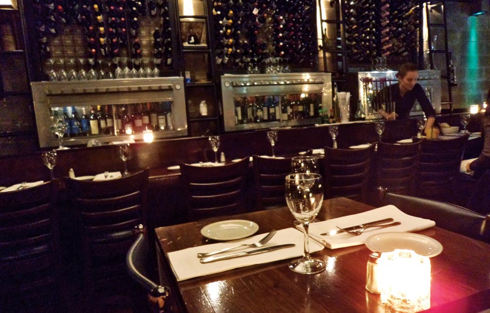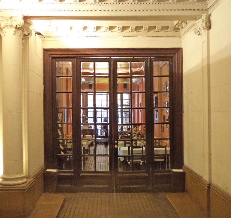 A entrada, uma escada iluminada por dois candelabros, dá a impressão que você está indo para o lugar errado. Se não fosse por um quadro negro afixado praticamente na calçada, dificilmente alguém encontraria esse restaurante. Mas ao entrar, essa falsa impressão fica mesmo do lado de fora.