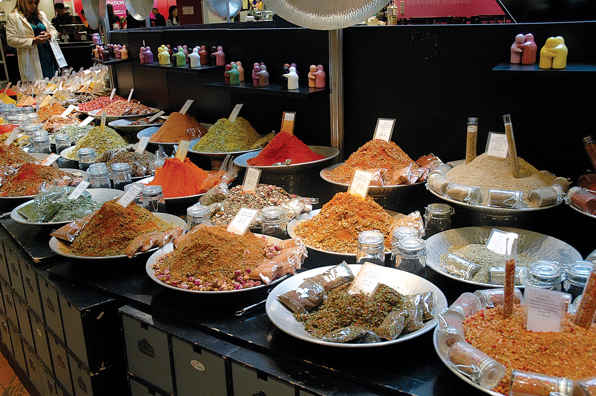 Outro lugares que me chamou a atenção foi a Galeria Lafayette, um dos grandes templos do consumo em Paris. Enquanto as turistas ficavam embelezadas com os estandes de grifes famosas como Channel, Bulgari, Christian Dior, John Galliano, Louis Vuitton, Nina Nicci, Yves Saint Laurent e tantas outras, procurei o espaço gourmet. Havia muita coisa interessant para se deliciar. Mas o espaço dedicado às especiarias mereceu atenção mais detalhadas. Fiquei impressionado com a variedade de pimentas, condimentos, azeites, molhos e outras iguarias. Com a devida permissão do atendente, saí cheirando quase tudo o que encontrava pela frente. Foi um “porre” de odores que eu jamais esquecerei. Depois de insistir um pouco, consegui tirar algumas fotos para ilustrar esta matéria.