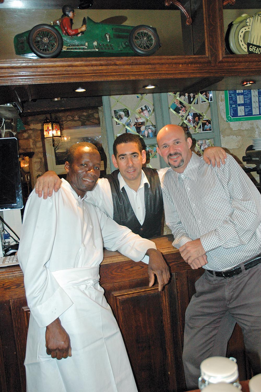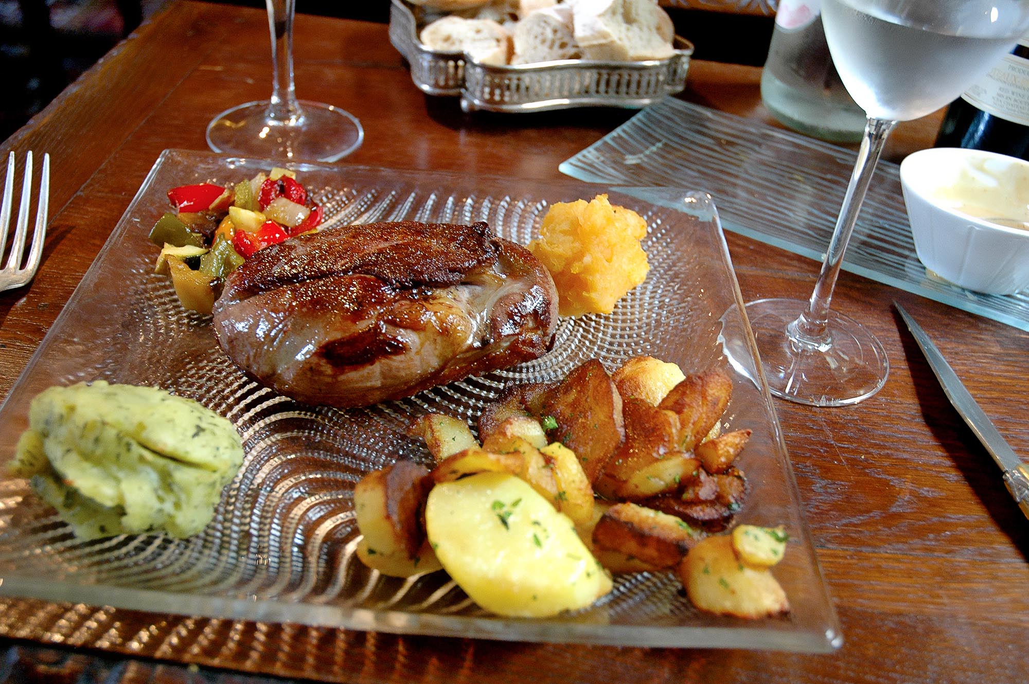 Outro achado em Paris foi um bistrô próximo à famosa igreja de Notre Dame, Au Vieux Paris (24, rua Chanoneinesse), instalado numa pequena e bucólica rua. De excelente comida, a casa funciona em um imóvel bastante antigo, datado de 1512, e oferece aos clientes a cozinha tradicional francesa, com cardápio enxuto mas tudo muito bem preparado pelo chef Kebe Babery. O atendimento fica a cargo do simpático maître Frederic Benani, que nos recebeu muito bem. O ambiente é realmente bonito e divide-se em dois, um minúsculo, no térreo e com poucas mesas (onde fiquei), decorado com objetos antigos, e outro no primeiro andar, um pouco sóbrio com paredes vermelhas. As mesas são muito bem arrumadas, com talheres de prata, louça antiga e taças nada convencionais. Na hora de pedir um vinho, o cliente é convidados a conhecer a adega do bistrô, que fica num subterrâneo com controle de temperatura. Os vinhos, todos franceses, são separados por faixa de preço, a partir de 20 euros até 200 euros.